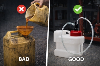 - Use sealed transfer containers (no open buckets or funnels)